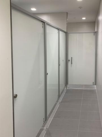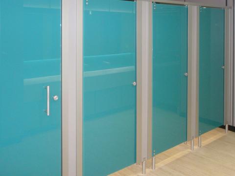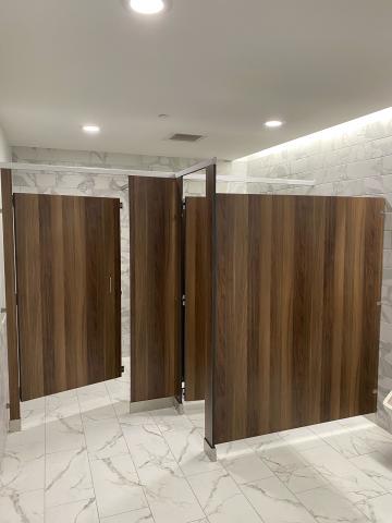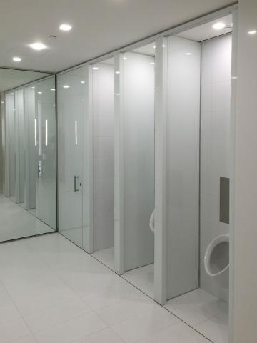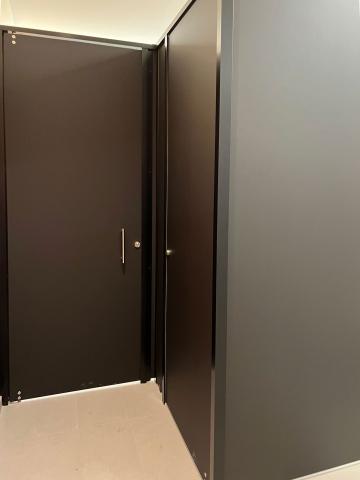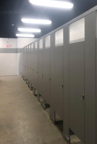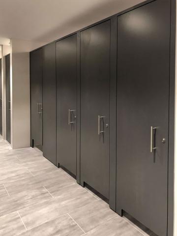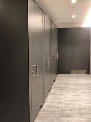 Partnering with Gensler and Fast Track Specialties, Thrislington cubicles installed Flow compact grade cubicles in the fitness center bathroom and shower areas at Houston Center in downtown Houston, Texas. Thrislington customized the stalls to the fitness center's requested specification, including a 300mm gap at the top of each cubicle to add light and increase ventilation. ADA regulations require a 9-inch floor gap in ADA cubicles to allow room for wheelchair wheels. Thrislington's customization capabilities allowed the fitness center to create a compliant no-sightline bathroom and shower area.